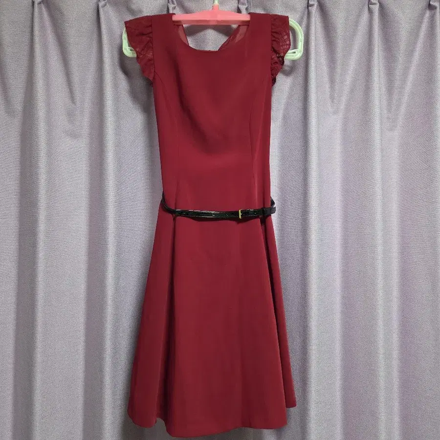 프릴 소매 디자인의 버건디 A라인 드레스, 사이즈 36, 광택 있는 블랙 컬러 벨트 포함.