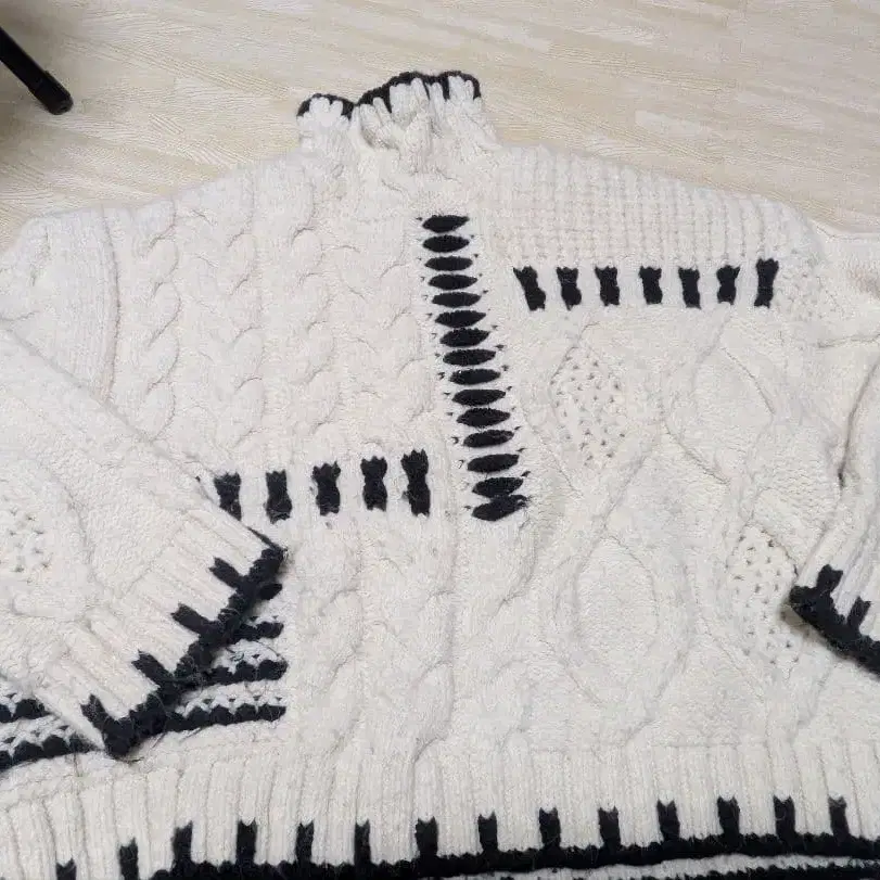 아이보리와 블랙 색상의 케이블 짜임 디자인 하이넥 스웨터. - 색상: 아이보리, 블랙 - 디자인: 케이블 짜임, 스트라이프 - 스타일: 하이넥 니트 특유의 약간의 보풀이 있습니다. 방문해 주셔서 감사합니다.