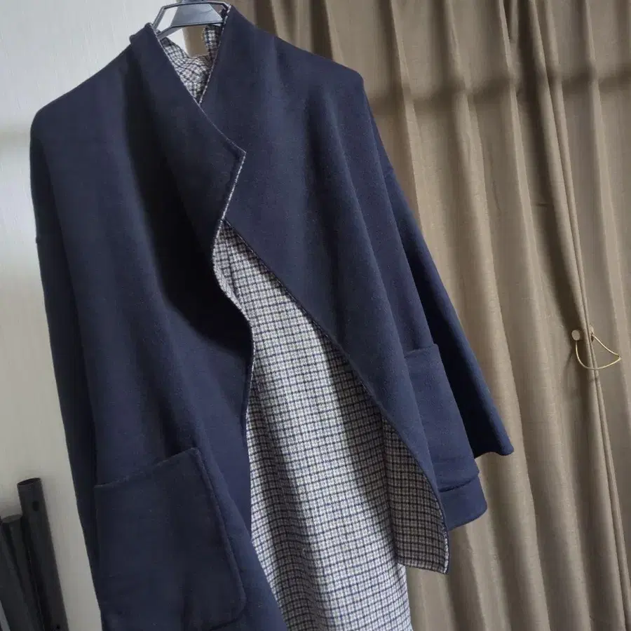 네이비 색상의 플리스 소재로, 체크 무늬 안감이 특징인 롱 코트입니다. ※ 리버서블입니다! - 색상: 네이비 - 소재: 플리스 - 안감: 체크 무늬 방문해 주셔서 감사합니다. 소중히 여긴 나머지 거의 착용하지 않았습니다.