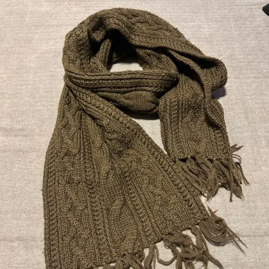 올리브 그린 색상의 케이블 짜임 니트 머플러입니다. 프린지가 달려 있어 스타일리시합니다. 아마도 울 소재일 것입니다. - 색상: 올리브 그린 - 디자인: 케이블 짜임 - 프린지: 있음 - 소재: 니트 방문해 주셔서 감사합니다.