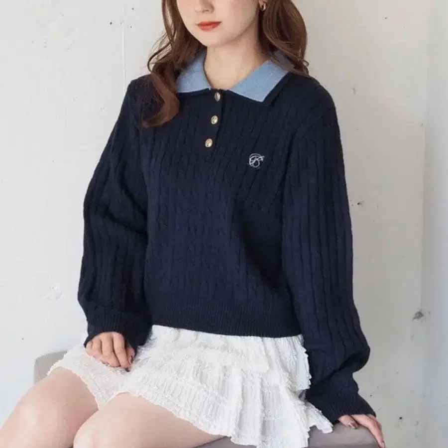로고 자수와 레트로한 카라 디자인이 요즘 느낌 나는 케이블 니트입니다.