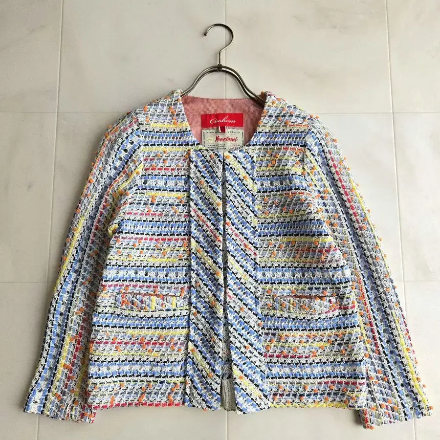화이트 베이스에 빨간색, 노란색, 블루 등의 트위드 짜임이 화려한 한 장입니다.