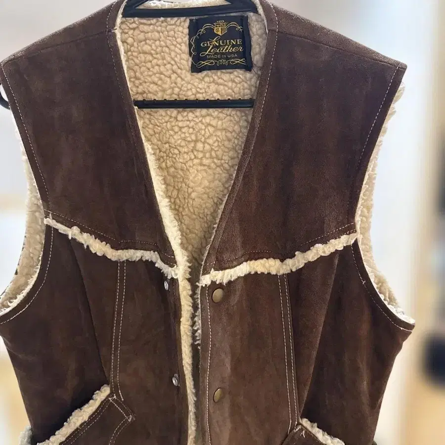 천연 가죽 소재의 브라운 베스트, 쉘 라이닝으로 따뜻합니다. - 소재: 천연 가죽 - 제조국: 미국제 - 색상: 브라운 - 디자인: 쉘 라이닝 - 포켓: 앞 포켓 2개 방문해 주셔서 감사합니다. 사이즈 - M