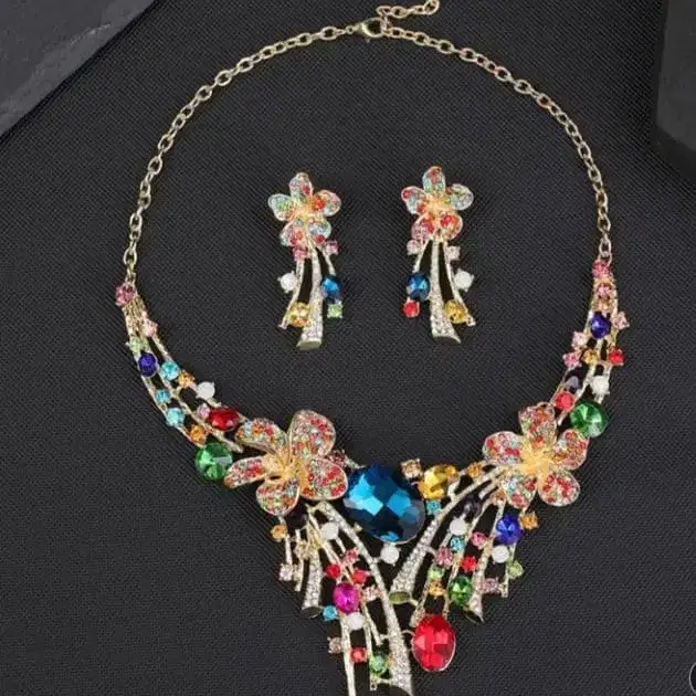컬러풀한 꽃 모티브의 목걸이와 귀걸이 세트. - 세트 내용: 목걸이와 귀찌 세트 - 디자인: 컬러풀한 꽃 모티브와 보석 장식 - 색상: 다색 (빨간색, 파랑, 그린, 골드 컬러 등) - - 스타일: 웨딩이나 파티용 방문해 주셔서 감사합니다.