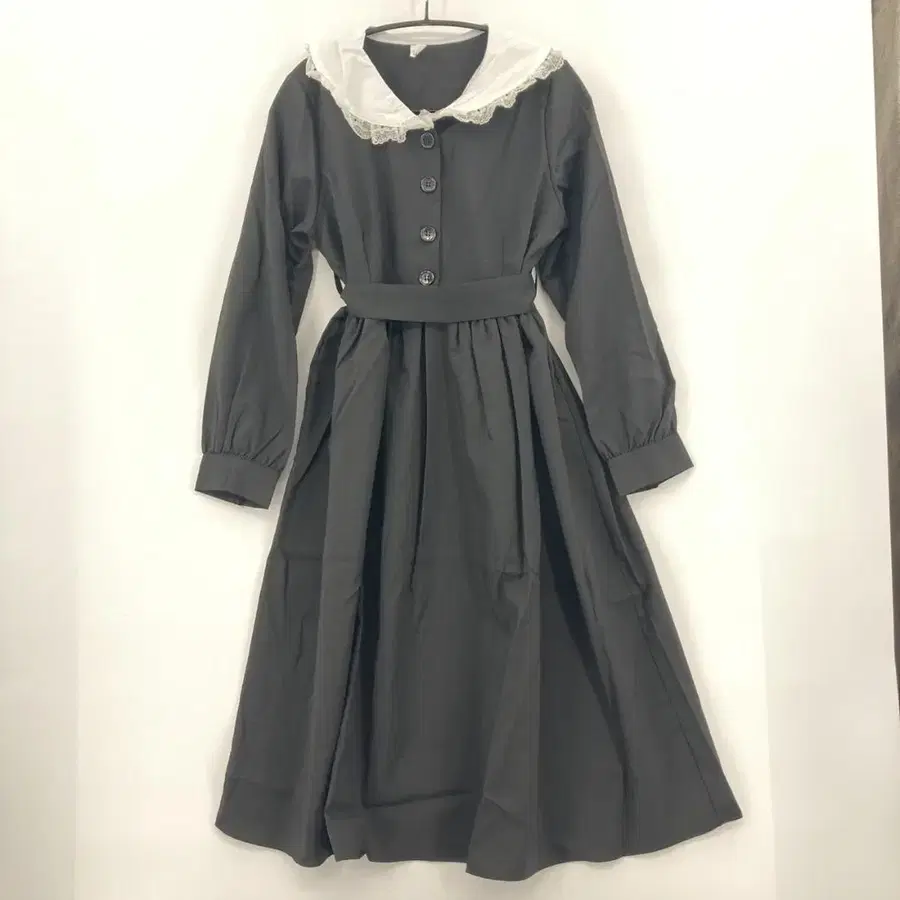 LINKAKA의 세일러 카라 원피스입니다. 차분한 다크 그레이 색상에 화이트 세일러 카라가 돋보이는 고급스럽고 클래시컬한 디자인이 특징입니다.