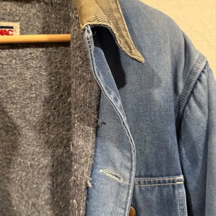 데님 소재의 블루 커버올, 버튼 프론트와 포켓 부착으로 실용적입니다.