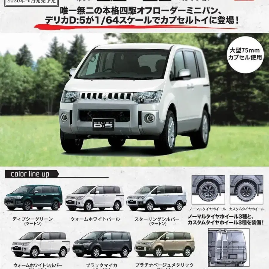 델리카 D:5의 1/64 스케일 미니카 세트, 6가지 색상 전개. 전 6종 컴플리트 세트 - 모델명: 델리카 D:5 - 스케일: 1/64 - 색상: 딥 씨 그린 웜 화이트 펄 스털링 실버 웜 화이트 실버 블랙 마이카 플라티나 베이지 메탈릭 - 부속품: 설명서, 추가 사다리 부품 토이즈 캐빈 캡슐 토이 방문해 주셔서 감사합니다.