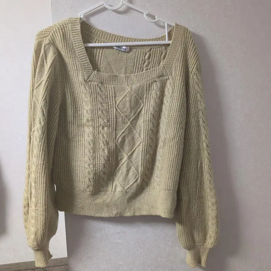 케이블 짜임 디자인의 크림색 스웨터, 벌룬 슬리브와 스퀘어 넥이 특징. - 색상: 크림색 - 디자인: 케이블 짜임 - 소매 스타일: 벌룬 슬리브 - 넥라인: 스퀘어 넥 방문해 주셔서 감사합니다. 계절 - 가을/겨울 얼룩, 찢김, 냄새 등 - 없음