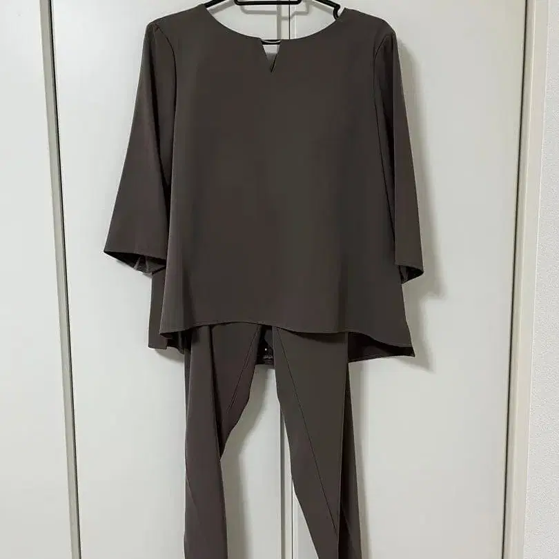 다크 브라운 V넥 셋업, 백 오픈 디자인으로 스타일리시합니다.