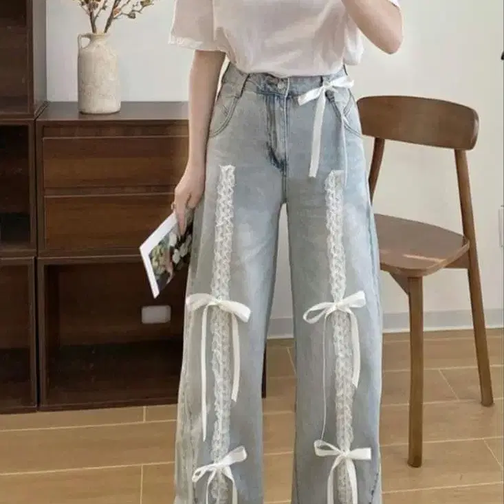 GRL 리본 레이스 프릴 와이드 데님 팬츠