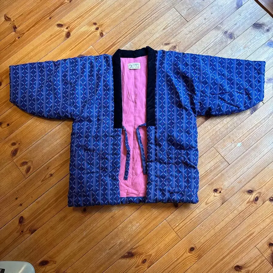 네이비와 핑크의 기하학 패턴 도테라, 코튼 소재로 쾌적한 착용감. - 색상: 네이비와 핑크 배색 - 브랜드: KIWANO - 디자인: 기하학 패턴 자수 - 소재: 코튼 - 스타일: 도테라 방문해 주셔서 감사합니다.