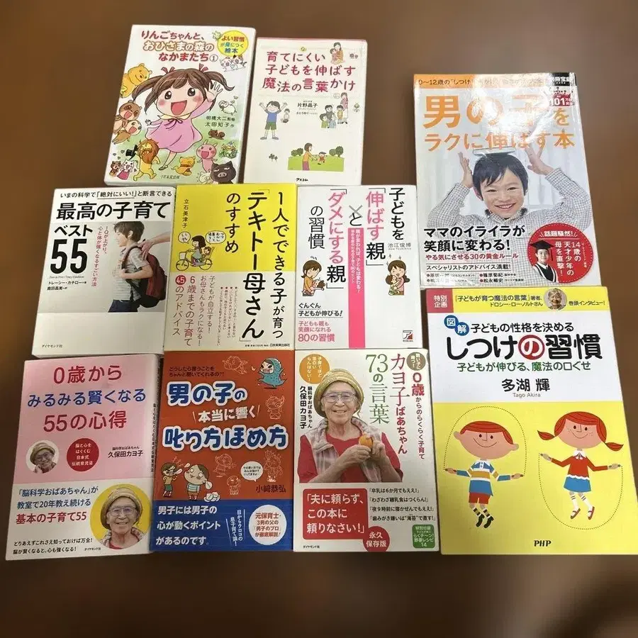 첫 출산이라 모르는 것 투성이어서 육아 서적을 여러 권 샀습니다. 읽은 횟수는 적습니다. 쿠보다 카요코 씨의 도서에는 굵은 선 부분에 마커 표시가 되어 있지만, 도서 자체의 상태는 매우 깨끗합니다.