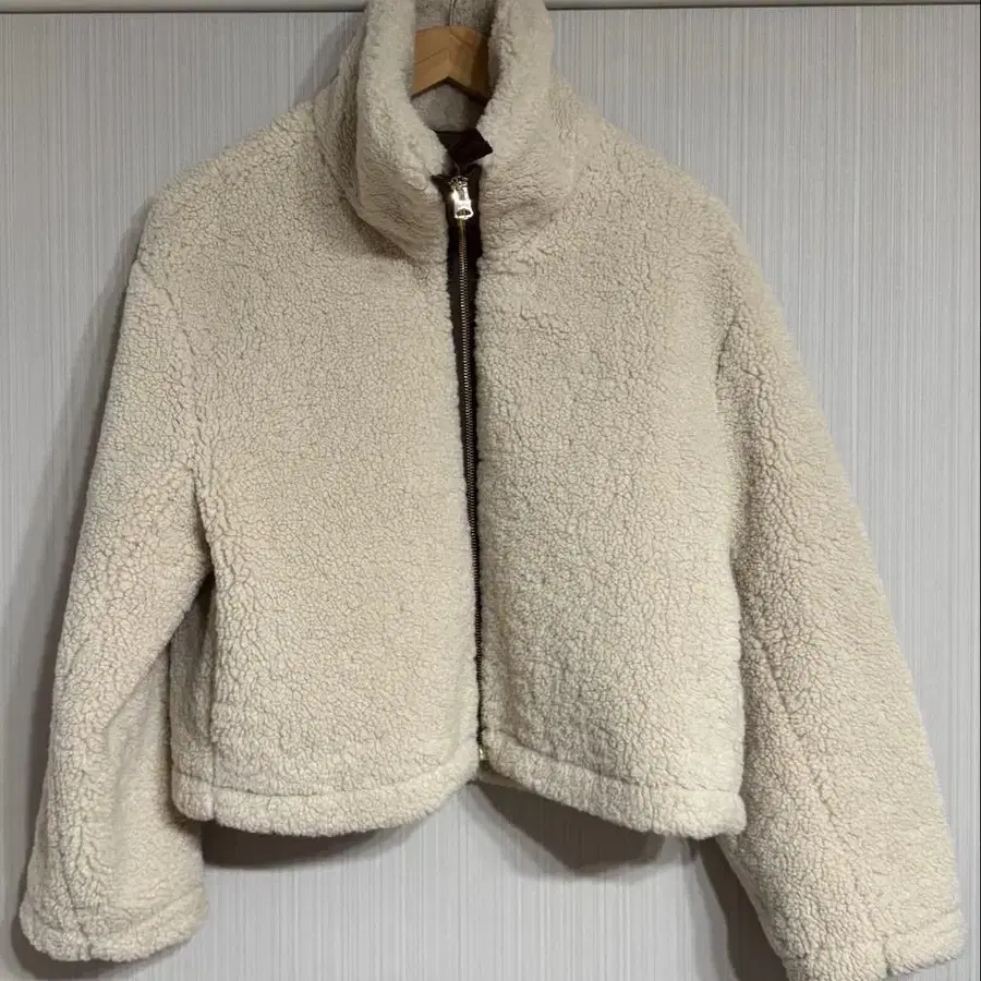 크림색 보아 자켓, 스탠드 카라와 프론트 지퍼가 달린 숏 기장 디자인. - 색상: 크림색 - 디자인: 보아 자켓 - 스타일: 숏 기장 - 옷깃 디자인: 스탠드 카라 - 지퍼: 프론트 지퍼 착용: 5회 미만. 얼룩 없음. 매우 따뜻합니다.