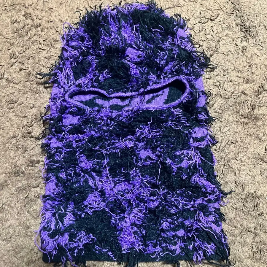 프린지가 달린 보라색과 블랙 디자인 니트 모자.