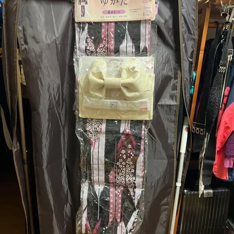 유카타 오비 세트 블랙 핑크 꽃무늬