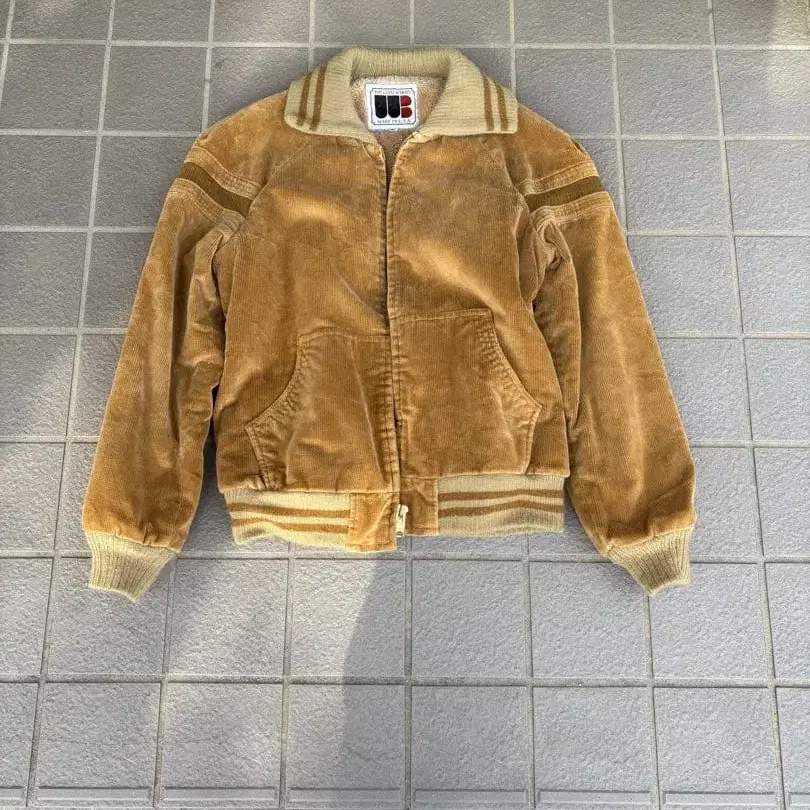 코듀로이 소재의 베이지 점퍼, 지퍼식이며 리브가 있고 사이드 포켓이 있습니다.