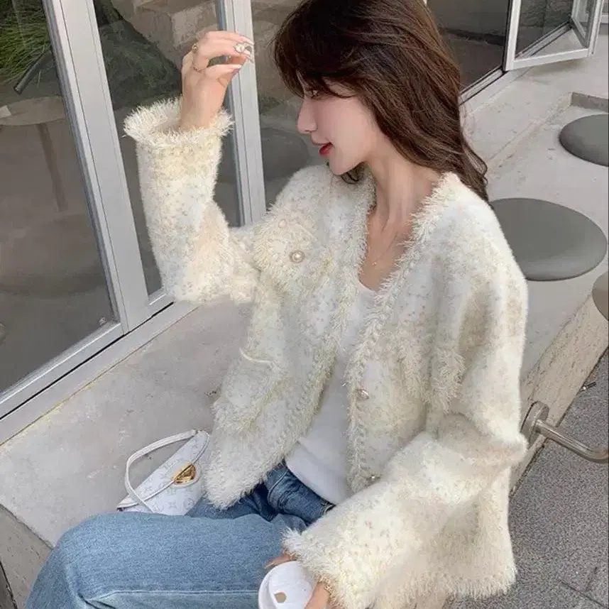 오늘만 가격 인하 샤기 라메 믹스 퍼 가디건 정가 25000엔