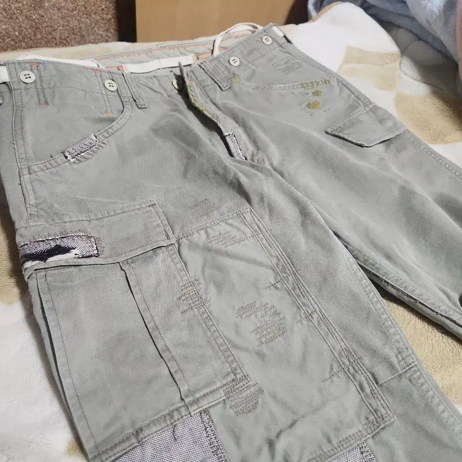 메이슨즈 카고 팬츠 사이즈 48 허리 평평하게 놓음 42, 밑위 29, 인심 65, 밑단 폭 21 컬러는 카키 (그레이에 가까운) 데미지, 패치워크 부위 외 큰 얼룩, 올풀림 등 없이 매우 깨끗한 상태입니다. ⭐ 할인 불가