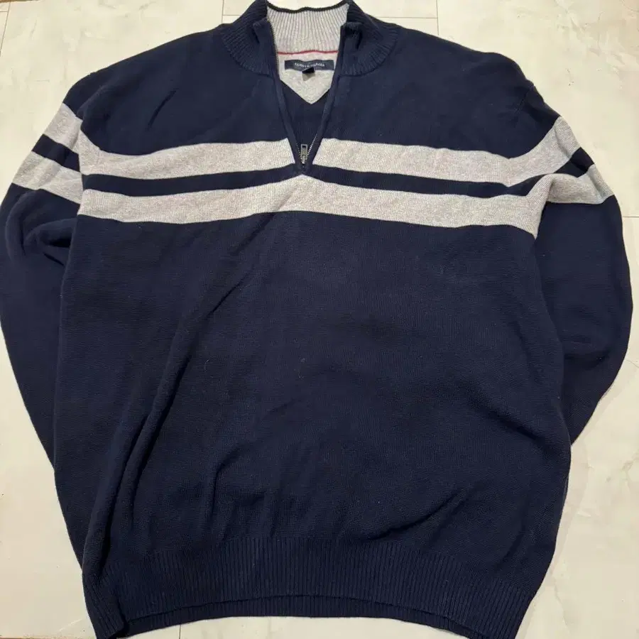 자동 번역되었어요. 원문보기네이비와 그레이 스트라이프 디자인의 집업 니트 스웨터.