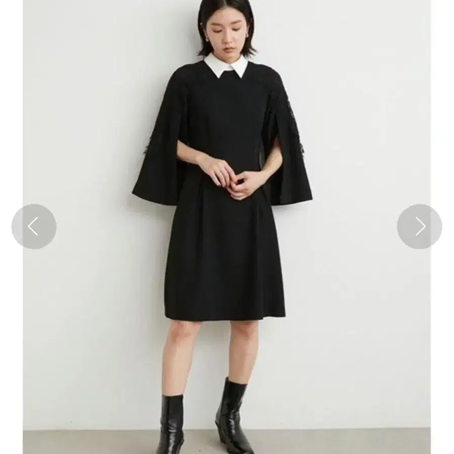 [Design/Styling] 배색으로 절개된 옷깃이 인상적인, 올해 유행하는 클래시컬한 분위기의 원피스. 입체적인 레이스 부분에는 비침이 있는 쉬폰 원단을 겹쳐 내추럴함을 연출했습니다. 너무 짧지 않은 고급스러운 무릎 기장도 좋은 인상을 줍니다. 소매 아래 버튼을 열면 소매가 케이프처럼 되는 2WAY 디자인이므로, 기분이나 스타일링에 맞춰 어레인지도 즐길 수 있습니다.