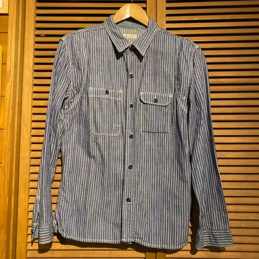 코튼 100% 스트라이프 패턴 긴팔 셔츠, 앞면에 포켓 2개 부착. - 소재: 코튼 100% - 디자인: 스트라이프 패턴 - 포켓: 앞면에 2개 - 스타일: 긴팔 셔츠 방문해 주셔서 감사합니다.