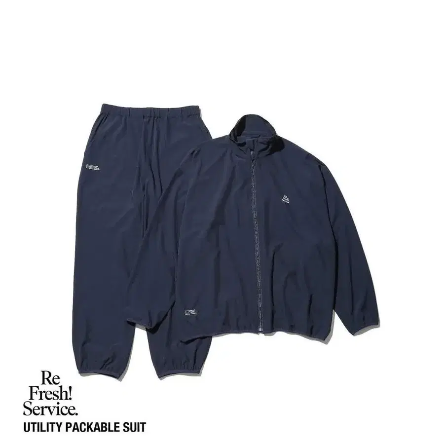나일론 소재의 다크 블루 Utility Packable Suit, 경량으로 휴대하기 편리한 셋업. - 브랜드: Re Fresh! Service - 모델명: Utility Packable Suit - 색상: 다크 블루 - 소재: 나일론 - 스타일: 셋업 방문해 주셔서 감사합니다.
