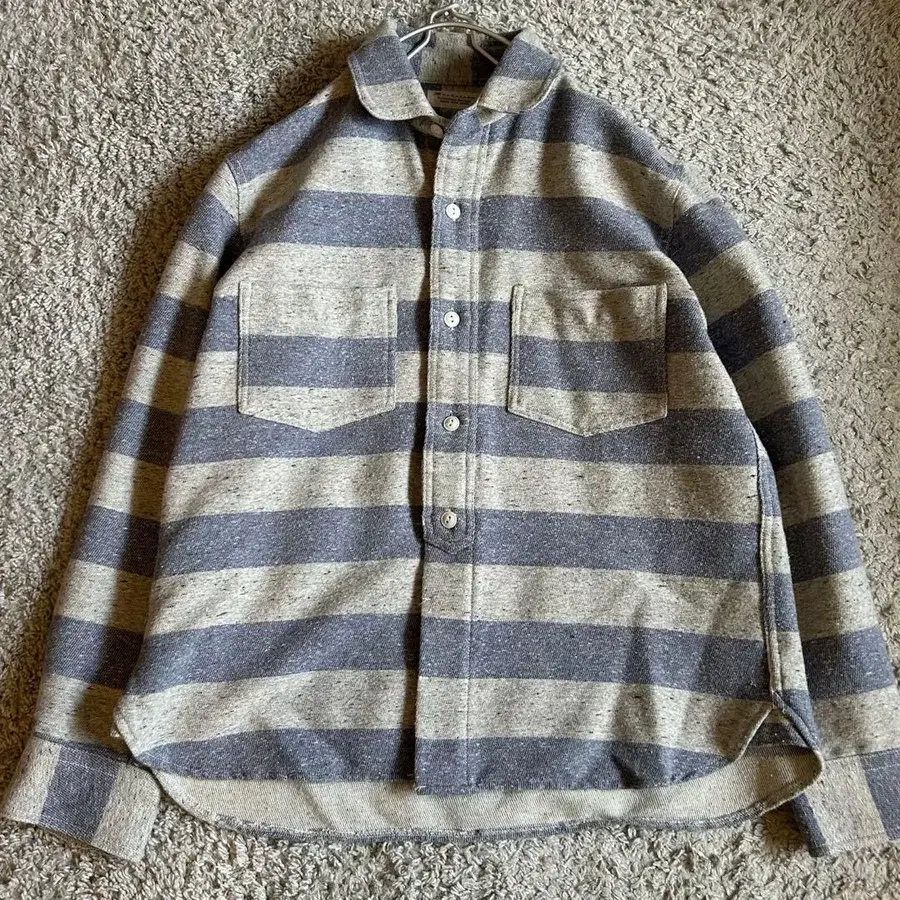 보더 무늬 디자인의 L 사이즈 긴팔 셔츠, 가슴 포켓 2개 부착, 일본제.