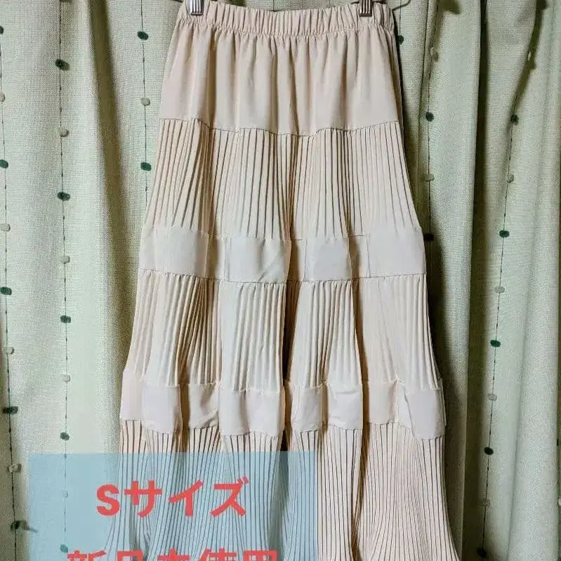 베이지 플리츠 롱 스커트, 허리밴딩으로 편안한 착용감.