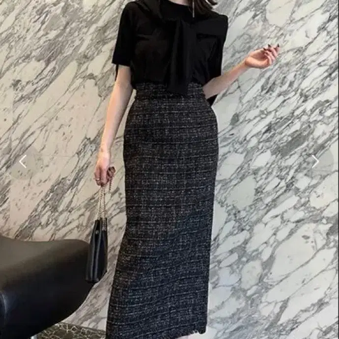 고급 트위드 소재를 사용한 타이트 스커트입니다.