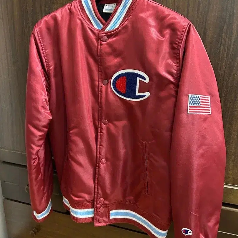 미국 국기 자수의 레드 바시티 자켓, M 사이즈, 스트라이프 리브 포함. - 브랜드: Champion - 색상: 레드 - 사이즈: M - 디자인: 미국 국기 자수 - 특징: 스트라이프 리브 포함 방문해 주셔서 감사합니다.