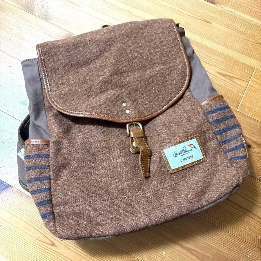겨울에 딱 맞는 원단, 브라운 백팩, 사이드 스트라이프 디자인 포켓과 지퍼 달린 포켓이 특징입니다.