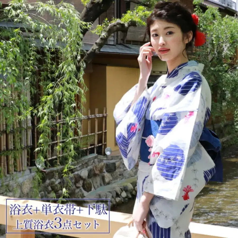 유카타 오비 일본 나막신 세트 파랑과 화이트 스트라이프