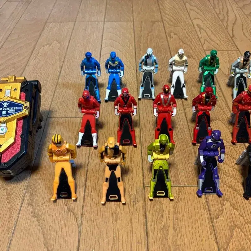 자동 번역되었어요. 원문보기다채로운 색상의 슈퍼전대 히어로 레인저 키와 변신 굿즈 세트.