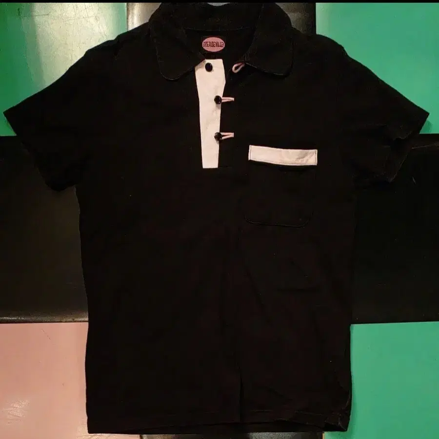 [디자인] 카라 뒷면이 핑크색으로 절개, 가슴 포켓 부착