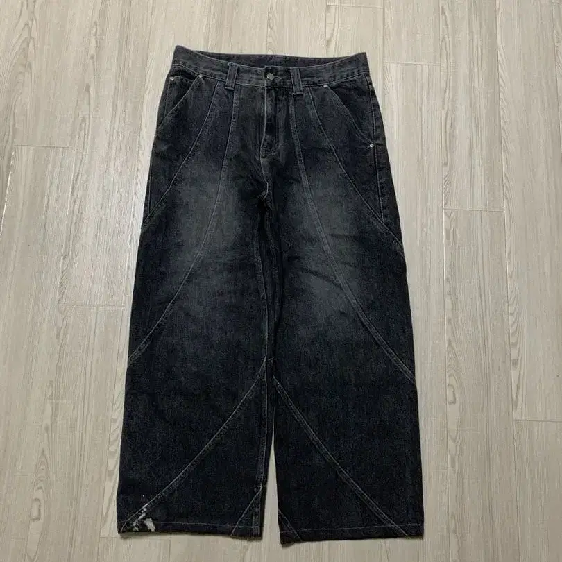 유니크한 스티치 디자인의 다크 그레이 와이드 레그 데님 팬츠. - 색상: 다크 그레이 - 디자인: 유니크한 스티치 디자인 - 소재: 데님 - 스타일: 와이드 레그 - 허리: 버튼 포함 - 기타: 앞면에 포켓 있음 방문해 주셔서 감사합니다. 사이즈 - L