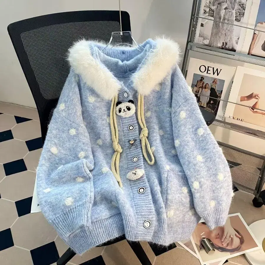 스카이블루 색상의 폼폼 무늬 니트 스웨터, 퍼 후드와 팬더 자수가 특징입니다. - 색상: 스카이블루 - 디자인: 폼폼 무늬 - 후드: 퍼 후드 - 버튼: 프론트 버튼 - 특징: 팬더 자수 - 소재: 부드러운 니트 - 후드 소재: 퍼 소재 방문해 주셔서 감사합니다. 사이즈 - M
