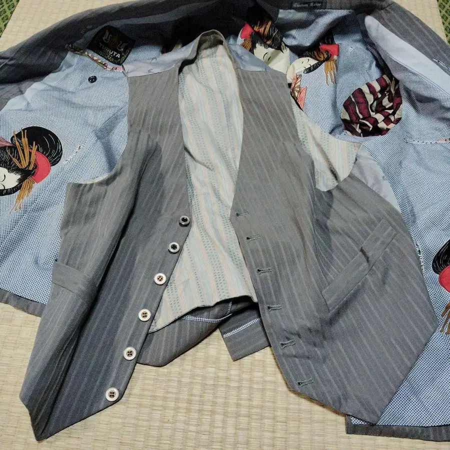 물려받은 수트 한 벌! 요즘 보기 힘든 안감이 있는 오이란 놀이꾼 수트입니다! 어디까지나 중고이므로 이해해 주시는 분만 거래 부탁드립니다. 보존 상태가 좋지 않아 주름이 꽤 있습니다.