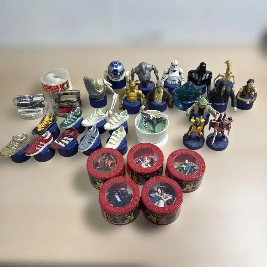 다양한 캐릭터 피규어와 미니어처 스니커즈 컬렉션.