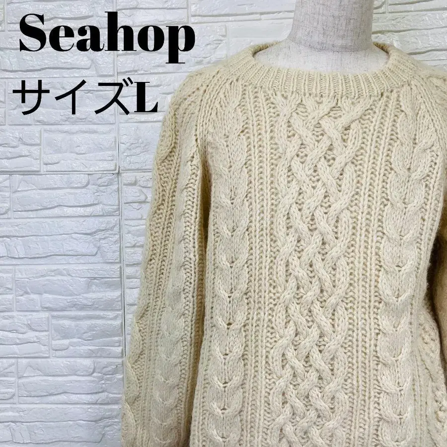 Seahop의 케이블 짜임 긴팔 니트 스웨터입니다. 부드럽고 온화한 인상의 크림색에 표정이 풍부한 케이블 짜임이 더해진 아이템입니다. 넉넉하게 입을 수 있는 L 사이즈로, 성숙한 릴랙스 스타일에 딱 맞는 다용도 니트입니다(*^^*)