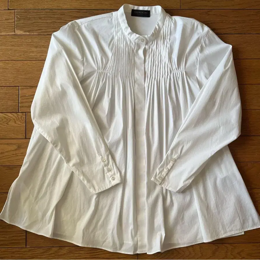 소매는 핀턱 2개, 장식 버튼이 달려 있어 열리지는 않지만, 스트레치가 들어가 있어 그대로 걷어 올릴 수 있습니다.
