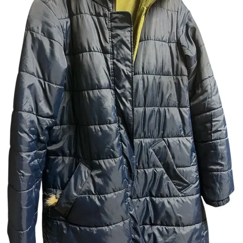 네이비와 그린 색상의 퀼팅 다운 자켓입니다. 퍼가 달린 후드와 2개의 포켓이 특징입니다. 리버서블 다운입니다. - 색상: 네이비 - 안쪽 색상: 그린 - 후드: 퍼 포함 - 디자인: 퀼팅 - 포켓: 2개의 프론트 포켓 방문해 주셔서 감사합니다. 리버서블 제품이라 택을 찾아보았으나 보이지 않습니다.