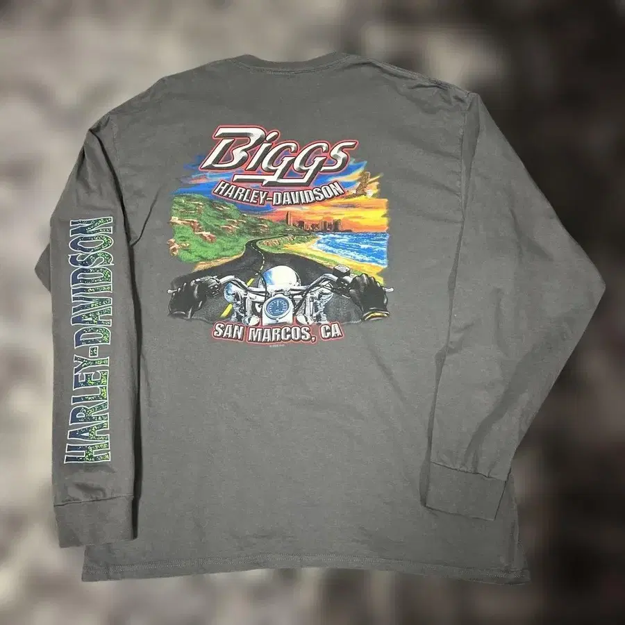 Harley-Davidson 롱 슬리브 T셔츠 Biggs Harley-Davidson SanMarcos 아메카지, 바이커 스타일은 물론 스트릿 패션에도 궁합이 좋습니다. 존재감 있는 코디로 완성됩니다. 구제 의류, 빈티지 아이템에 이해가 있는 분의 구매를 부탁드립니다. 신경 쓰이는 점이 있다면 부담 없이 댓글 주세요. 잘 부탁드립니다! 어깨 너비/가슴 너비/소매 길이/기장 어깨 너비 - 56cm 가슴 너비 - 56cm 소매 길이 - 65cm 기장 - 76cm 색상 - 그레이 계열 소매 길이 - 긴팔 패턴 디자인 - 프린트 (로고 등)