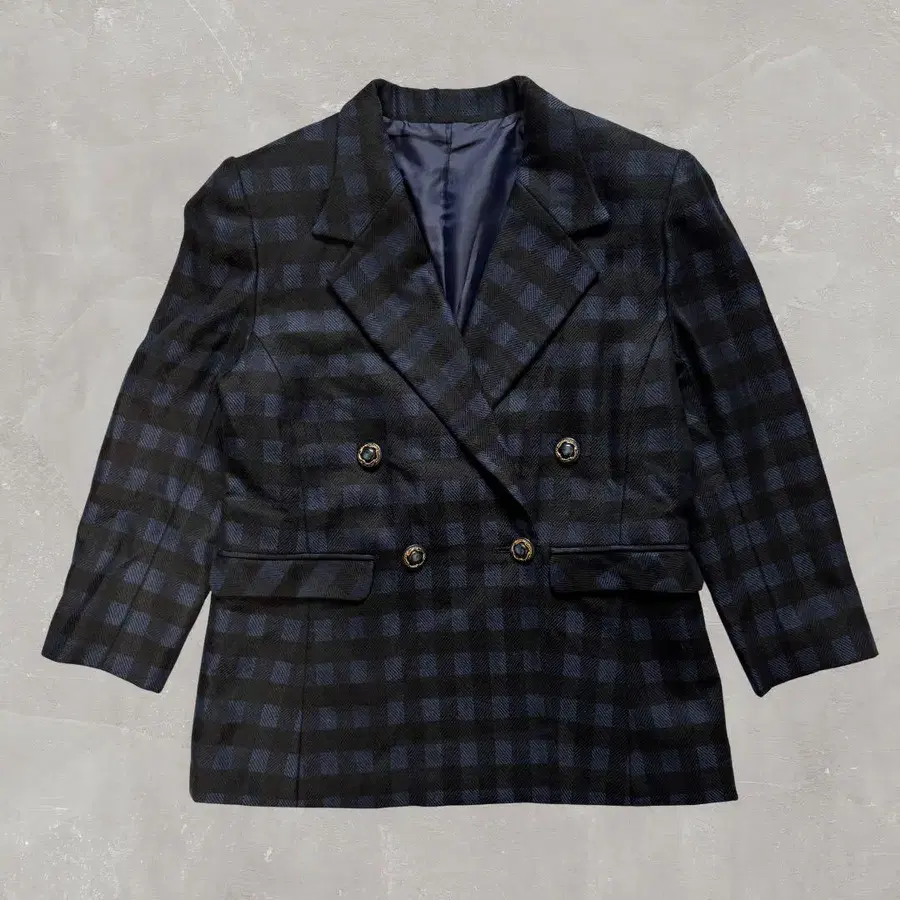 차분한 네이비 x 블랙 계열의 체크 무늬 더블 자켓입니다.