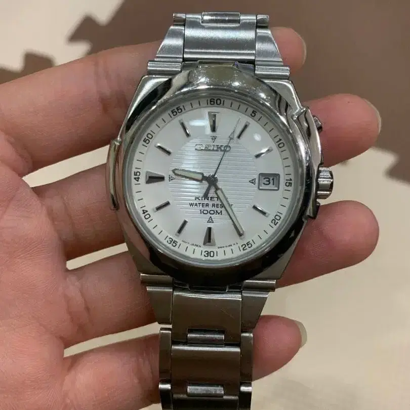 화이트 다이얼의 세이코 키네틱, 100m 방수, 스테인리스 스틸 밴드. 시계 상태는 사진으로 판단 부탁드립니다. 사진 확인 후, 잘 부탁드립니다. 본체만 있습니다. 작동은 하고 있으며, 현재 상태 그대로입니다. 환불, 반품 불가입니다. 방문해 주셔서 감사합니다.