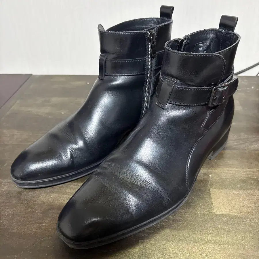 지퍼와 버클이 특징인 블랙 부츠. - 색상: 블랙 - 소재: 소가죽 - 구매 가격: 약 12000엔 - 디자인: 지퍼 있음, 버클 있음 - 스타일: 앵클부츠 - 상태: 오른쪽 발가락에 약간의 마찰, 오른쪽 뒤꿈치 안쪽에 마찰로 인한 흠집이 있지만, 몇 번 신었기 때문에 사용감은 다소 있습니다. 양해 부탁드립니다.