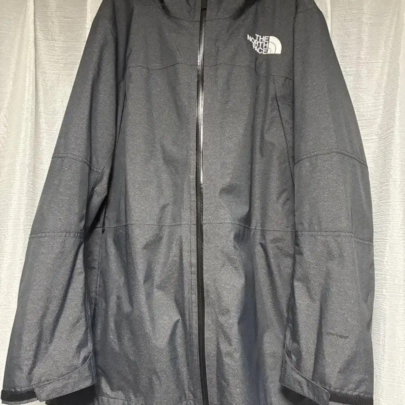 후드 부착 그레이 색상의 마운틴 후드티, THE NORTH FACE 자수 로고 포함.