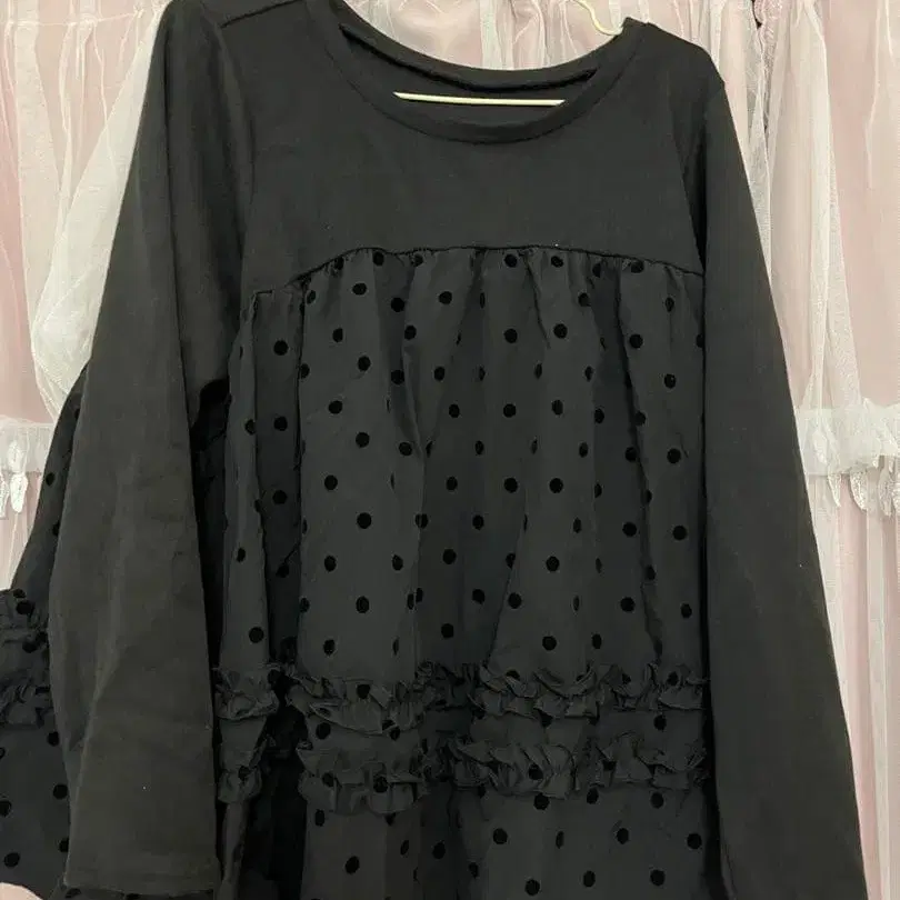 도트 무늬와 프릴이 특징인 블랙 긴팔 상의, L 사이즈. - 색상: 블랙 - 디자인: 도트 무늬, 프릴 포함 - 사이즈: L 방문해 주셔서 감사합니다. 사이즈 - 3XL(4L)