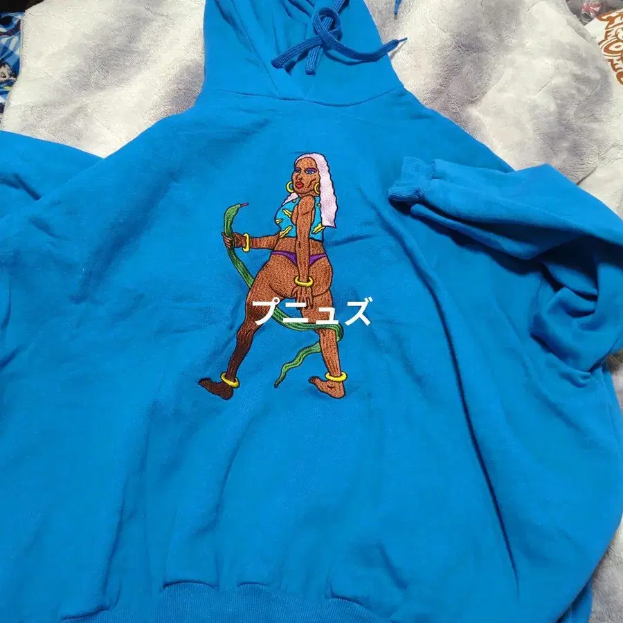 자동 번역되었어요. 원문보기선명한 파란색 후드티, 자수로 된 여성 캐릭터와 뱀 디자인이 특징입니다.