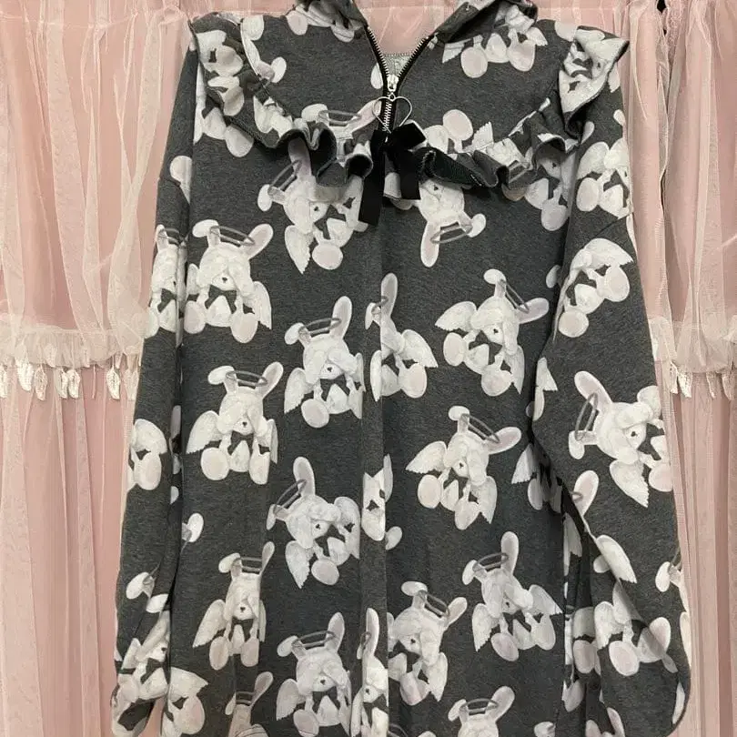 토끼 패턴 프릴 후드티, 부드러운 원단으로 캐주얼하게 연출 가능. - 디자인: 토끼 패턴의 그레이 후드티 - 프릴: 후드 부분에 프릴 부착 - 소재: 부드러운 원단 - 소매: 긴팔 - 스타일: 캐주얼 방문해 주셔서 감사합니다. 사이즈 - 3XL(4L)