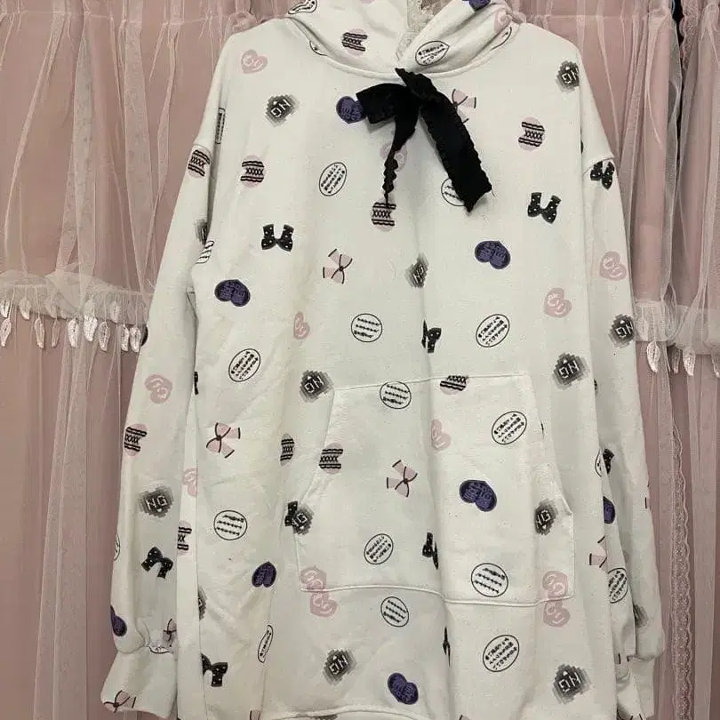 마카롱과 리본 프린트가 특징인 화이트 후드티. - 디자인: 마카롱과 리본 프린트 - 색상: 화이트 - 후드: 드로우 스트링 포함 - 포켓: 프론트 포켓 있음 - 장식: 리본과 레이스 디테일 방문해 주셔서 감사합니다. 사이즈 - M